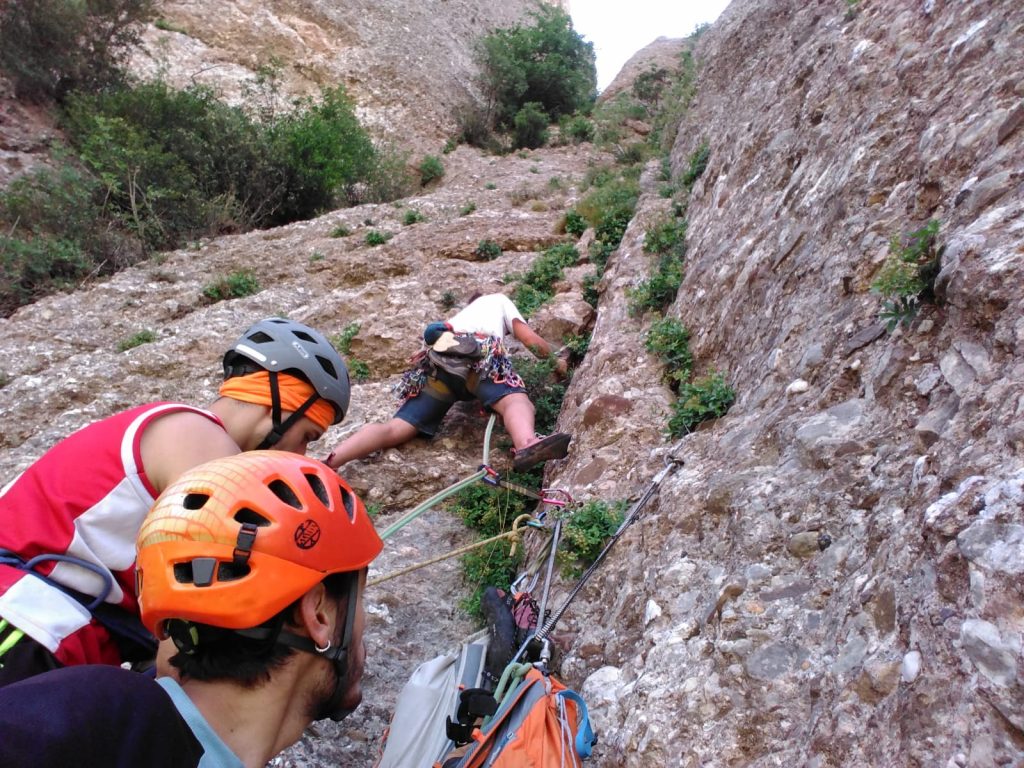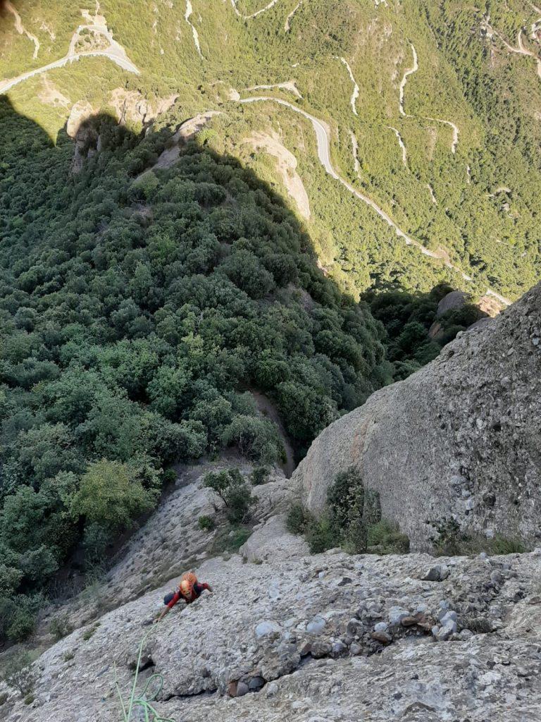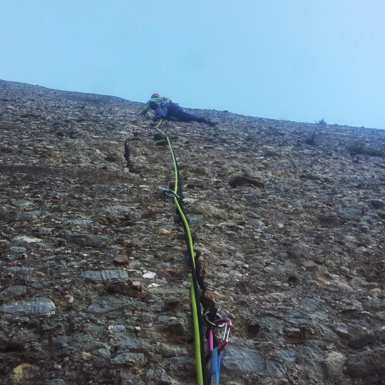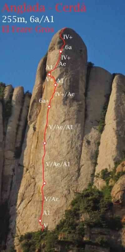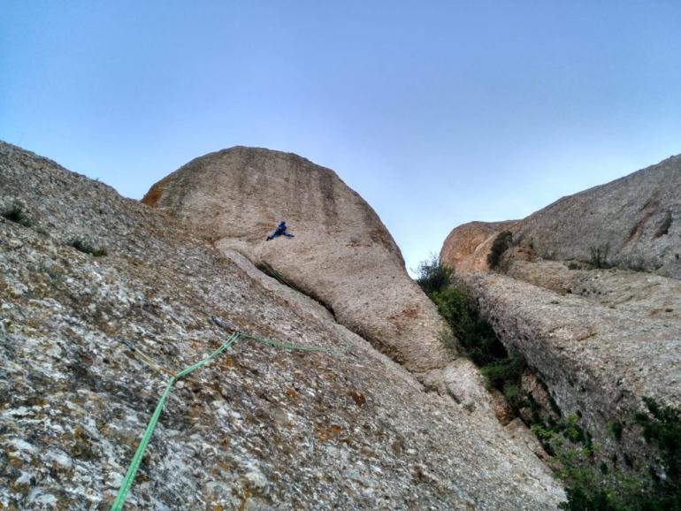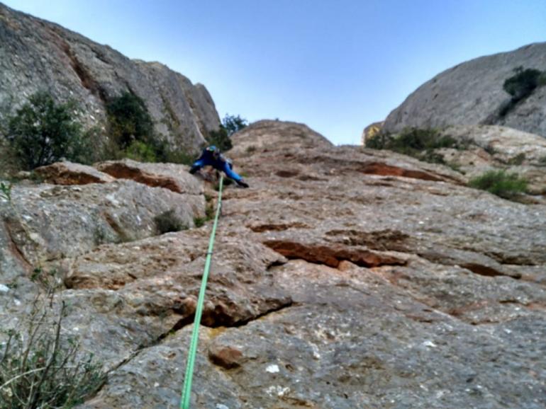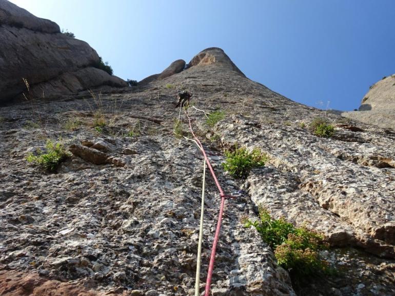 L4: Llarg vertical que continua seguint el diedre. Trobarem un parell de tacos de fusta al començament del llarg, 2 claus cap al final i bons emplaçaments on col·locar alguna cosa. Al final del diedre farem una petita trevessia de roca dubtosa cap a l'esquerra on trobarem la reunió (v+). Molt d'ull amb les pedres en aquest llarg, ja que la gran majoria aniran a parar a la reunió des d'on ens estan assegurant.