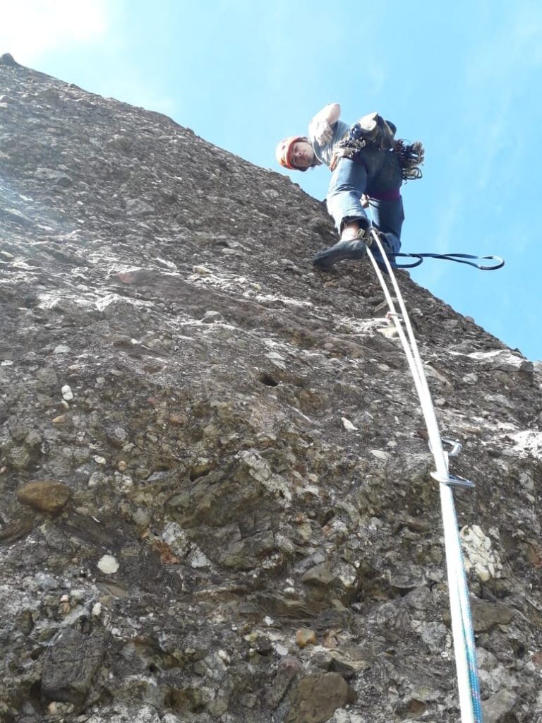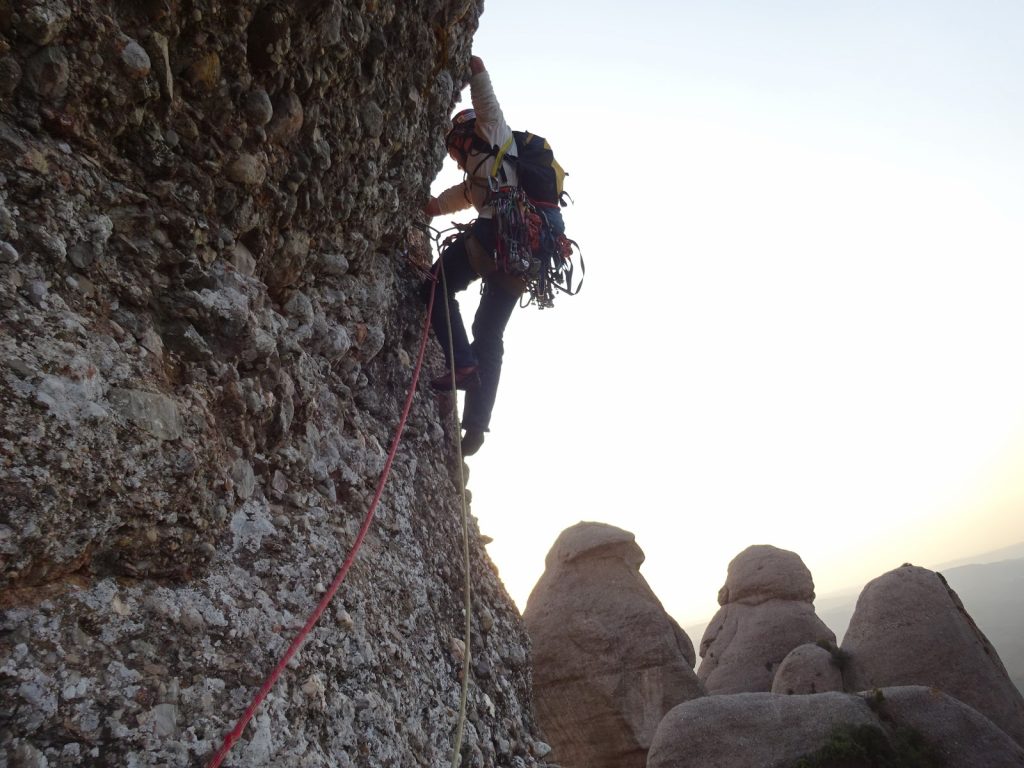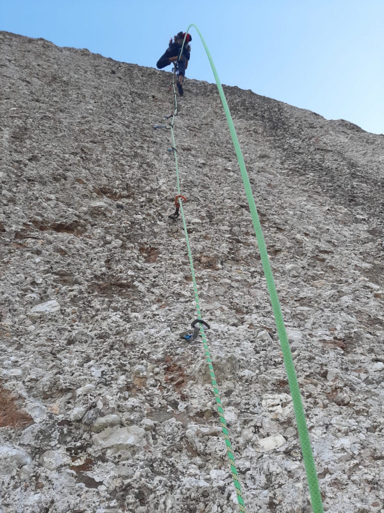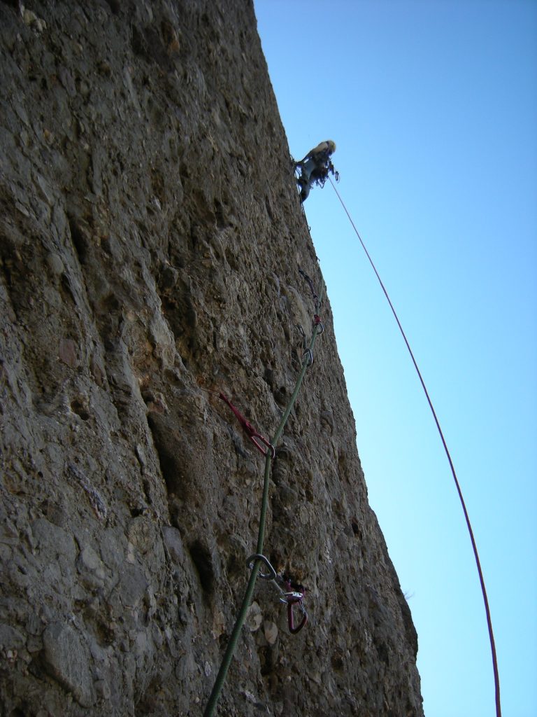 L4: Llarg vertical que continua seguint el diedre. Trobarem un parell de tacos de fusta al començament del llarg, 2 claus cap al final i bons emplaçaments on col·locar alguna cosa. Al final del diedre farem una petita trevessia de roca dubtosa cap a l'esquerra on trobarem la reunió (v+). Molt d'ull amb les pedres en aquest llarg, ja que la gran majoria aniran a parar a la reunió des d'on ens estan assegurant.