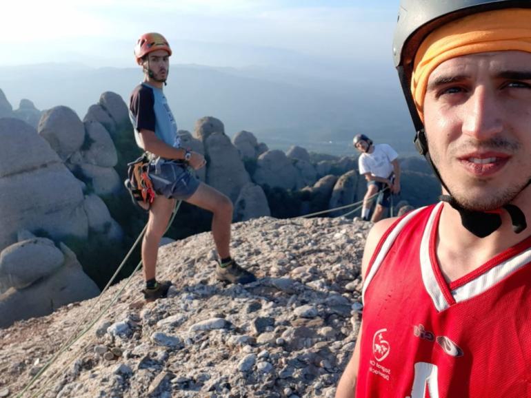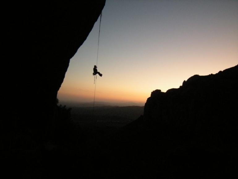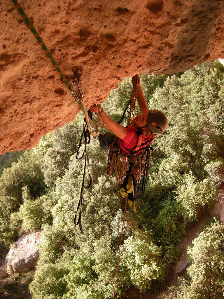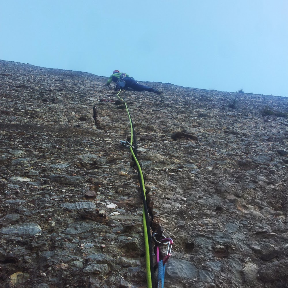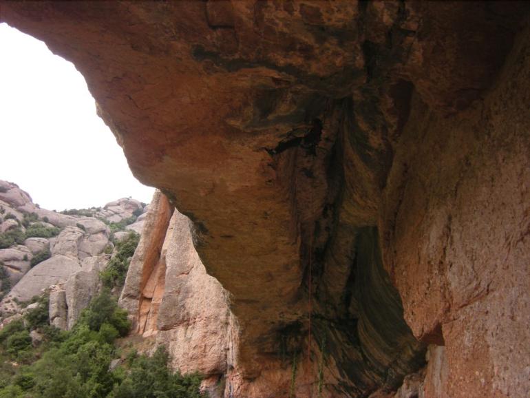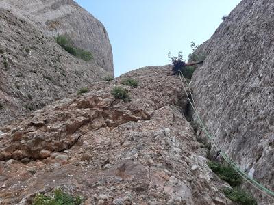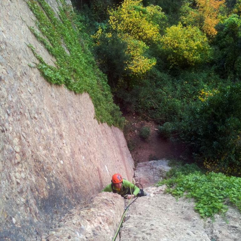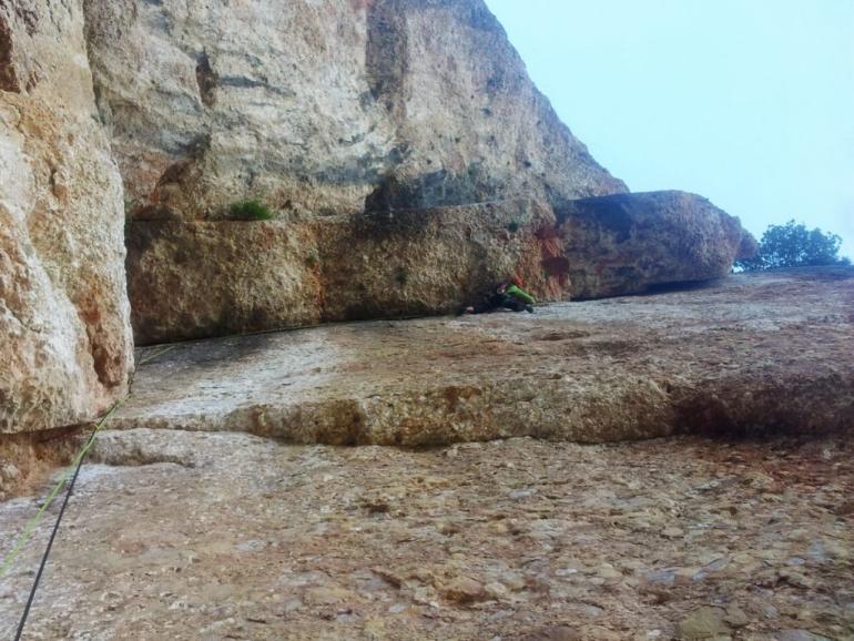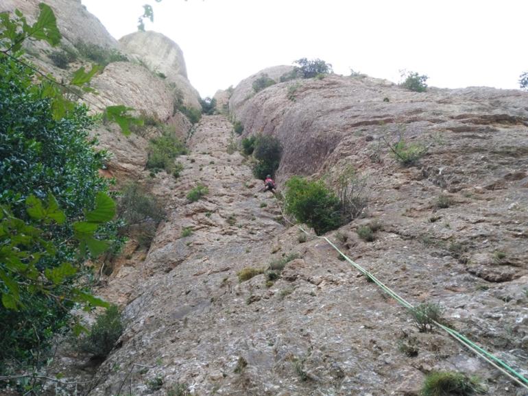 L5: Llarg de tràmit per arribar al veritable llarg. Sortirem de la reunió fins un petit pont de roca, a conitnuació trobarem un clau, i ja només quedarà seguir flanquejant uns 20 metres fins la reunió. Trobarem un parell d'arbres on col·locar alguna baga.