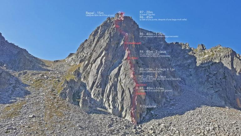 Seguirem l'esperó, passant a banda i banda , amb una escalada que va perdent dificultat però no la bellesa ni l'interès. Fins arribar a la repisa de la R5 (segons la nostra ressenya, doncs se'n poden fer de més o de menys), on ens enfilarem per l'esquerra de la gran fissura per pujar a un primera espatlla. Aquí, una baga descolorida ens indicarà el camí fins a una segona espatlla on nosaltres vem fer reunió en uns blocs. Des d'aqui, per un collet amb blocs, passem a la banda oest i ens enfilem a l'agulla per un diedre maco d'escalar i de protegir (i que veiem des de la reunió).